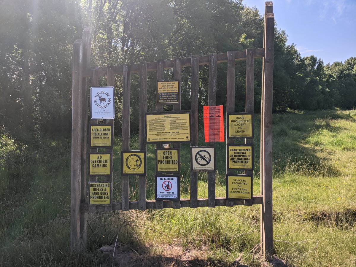 We proceeded another mile up the road and spotted the next Sauvie Island “rules sign” (on the maps this is just south of Round Lake). There is a marker next to a casual dirt path that can be followed for a 3-mile loop hike.