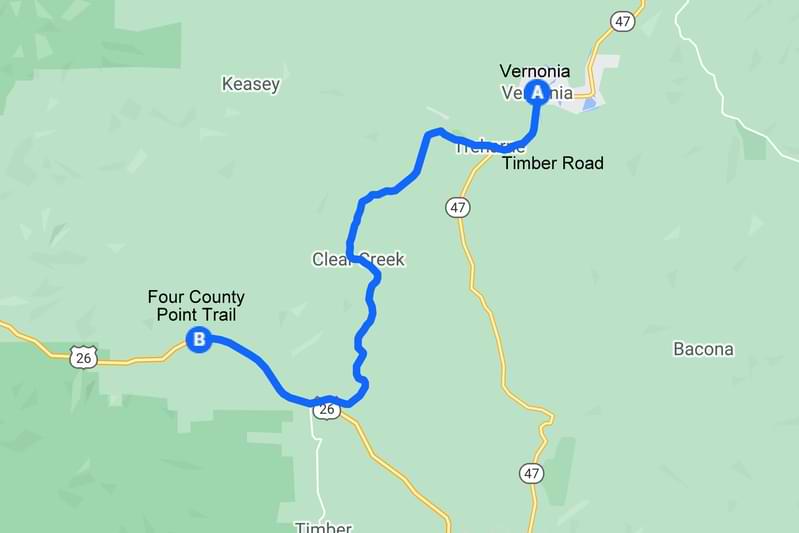 Four County Point Trail is just off of Highway 26, three miles west of Timber Road. You can see the sign easily from the highway.