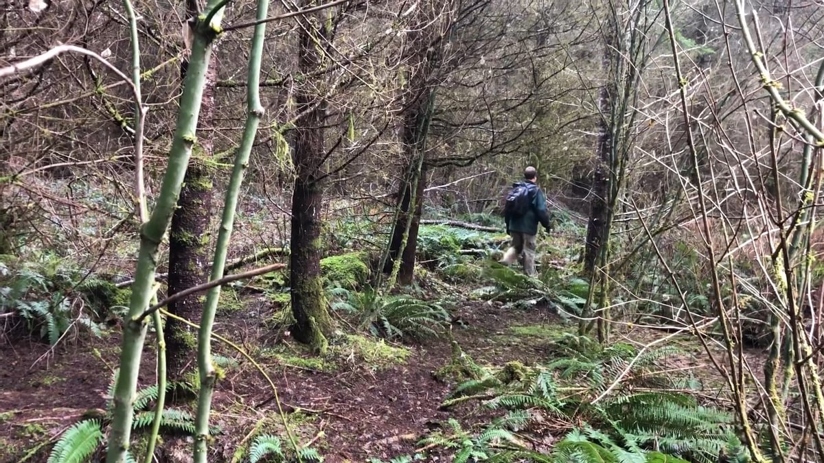 It took two miles of hiking to reach a spot directly above the Clatskanie River. On the maps it appeared there could be a long-dead road that would get us down, but the road had been buried beneath more recent clearcut and everything we could find petered out near the ridgeline. So we embarked on a steep bushwacking descent, dropping 450 feet in elevation over the course of 500 yards.