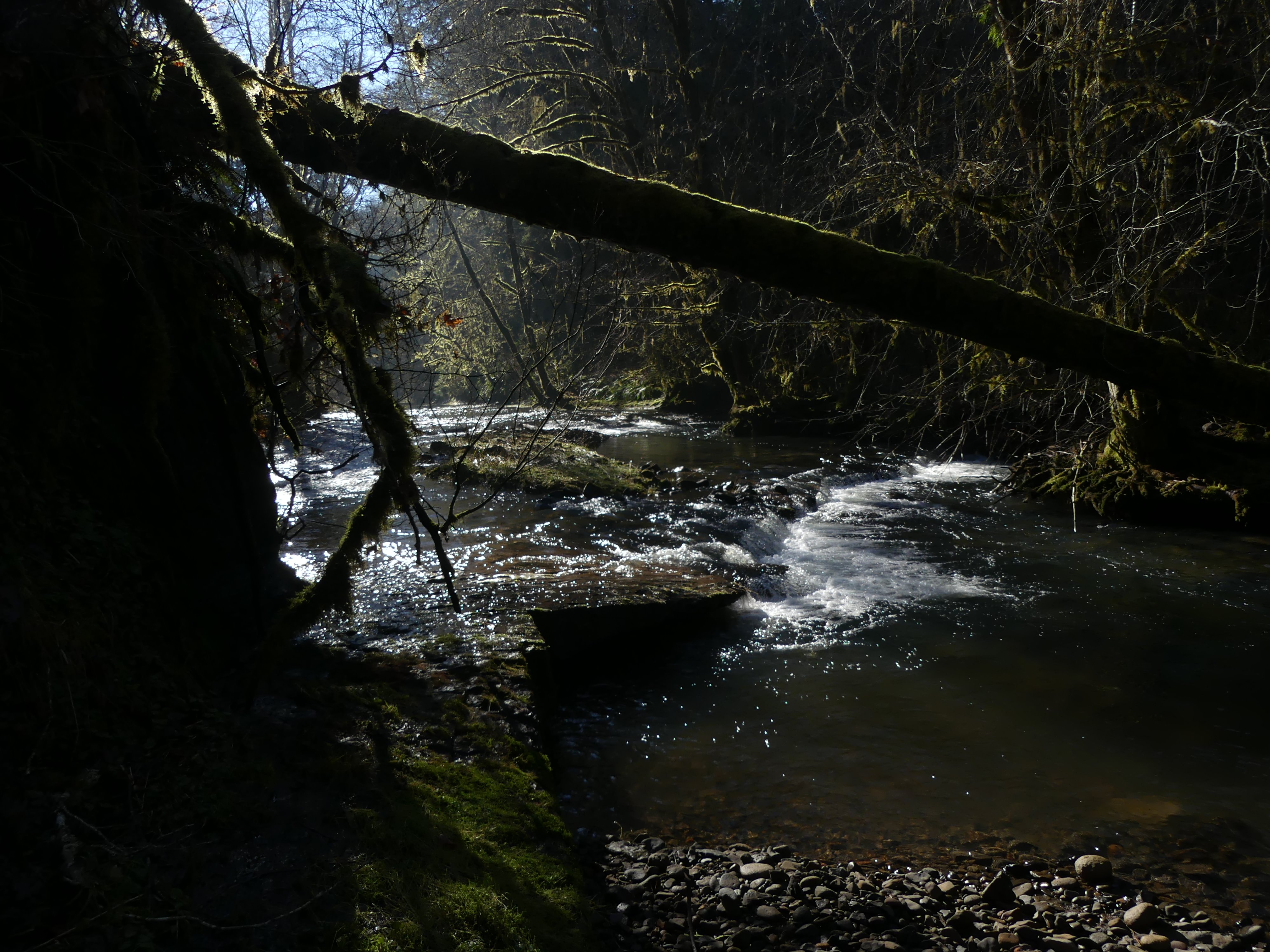 We reached the Clatskanie River without incident. It was gorgeous in the midday winter sun. I spotted a coyote trotting on the opposite bank, and Matt found a Columbia Torrent Salamander in a small inlet stream. Numerous dippers foraged in the rapids. There was a small falls just a foot or so high, but no fish ladder, so this was clearly not the waterfall we were looking for.