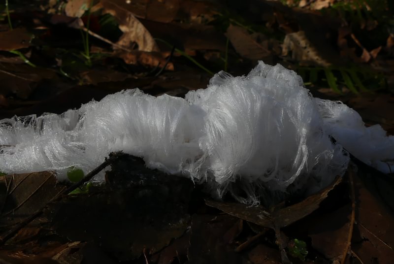 “Hair Ice”, also known as “Ice Wool” or “Frost Beard”, is an interesting local phenomenon that occurs when the temperature quickly cools below freezing on a humid night. A type of fungus growing in dead wood causes the ice to emerge from the wood in this wool-like structure, where it lasts until the morning sun melts it away.