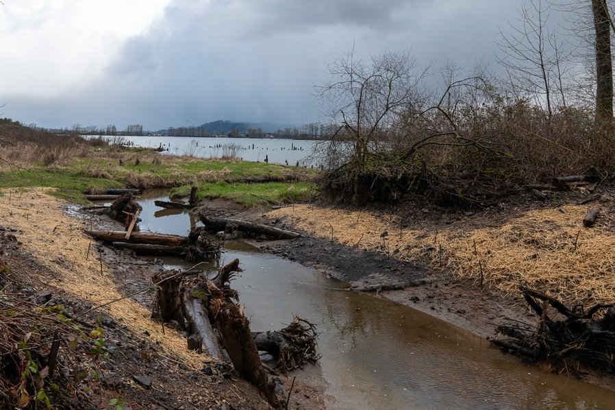 After this earth-moving, CREST planted thousands of native plants to support the restoration. Wetland species like wapato were fixed into the water, riparian trees and bushes bolstered the banks, and upland denizens, including common camas and Pacific madrone, were rooted into the mounds of excavated dirt.