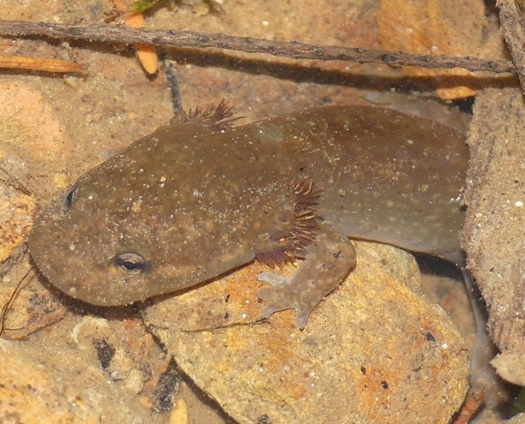 The Cope’s Giant Salamander was our most impressive amphibian find. This rare salamander (another Oregon Conservation Strategy and Sensitive Species) looks very similar to a neotenic Coastal Giant, but is smaller, has a more squared-off head, gill stalks that are stalked up rather than bushy, a more slender body with relatively shorter limbs, dotted rather than streaked coloration, a narrower tail fin with a rounded end, and slight color differences on the tail and belly. We were the first people to ever record the species in Columbia County. We had 3 sightings all in one spot.