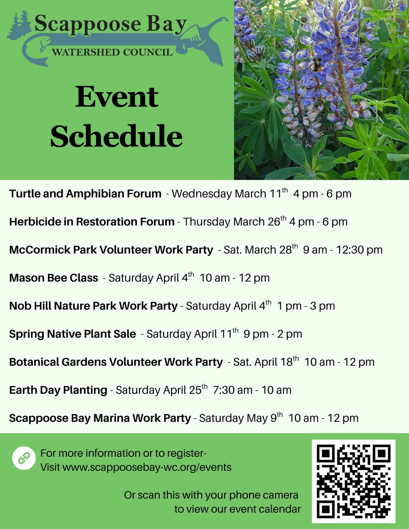 Volunteers are asked to register by Friday, April 3, by calling the Scappoose Bay Watershed Council at 503-397-7904 or by emailing info@scappoosebay-wc.org. For day of event, call 503-349-8586. Those with gloves and gardening tools should bring their own, though some will be provided at the event. Workers will remove lunaria and blackberries while also adding native plants donated by SBWC at the lower park.
