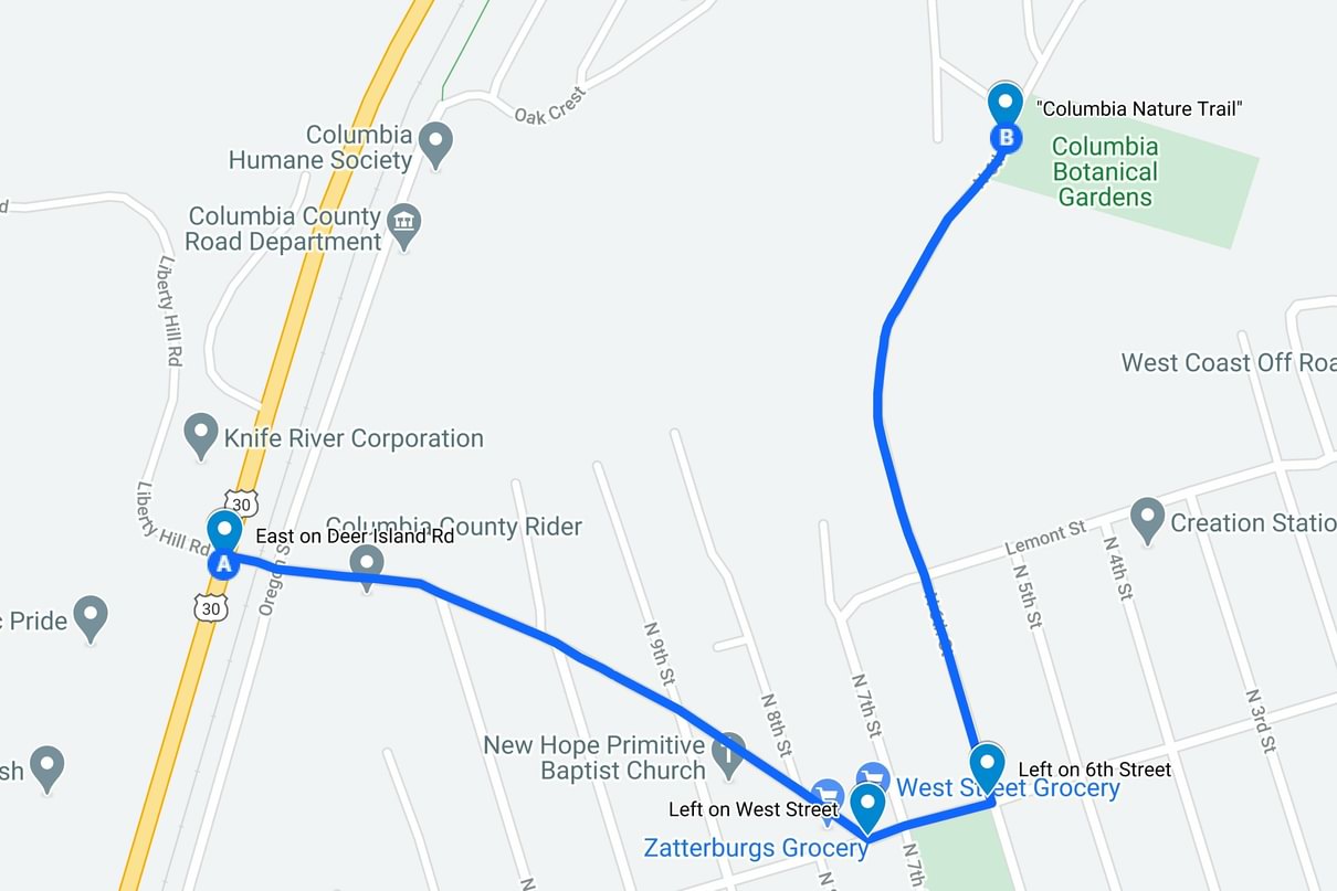 Where: In St. Helens turn east off Highway 30 onto Liberty Road. Go 0.5 miles to 6th St. and turn left, then another 0.6 mi to reach Forest Park Drive (on the left) just before the Elks Club parking lot. You will see the sign for Columbia Nature Trail on the right immediately across from Forest Park Drive (45.8740, -122.8060).