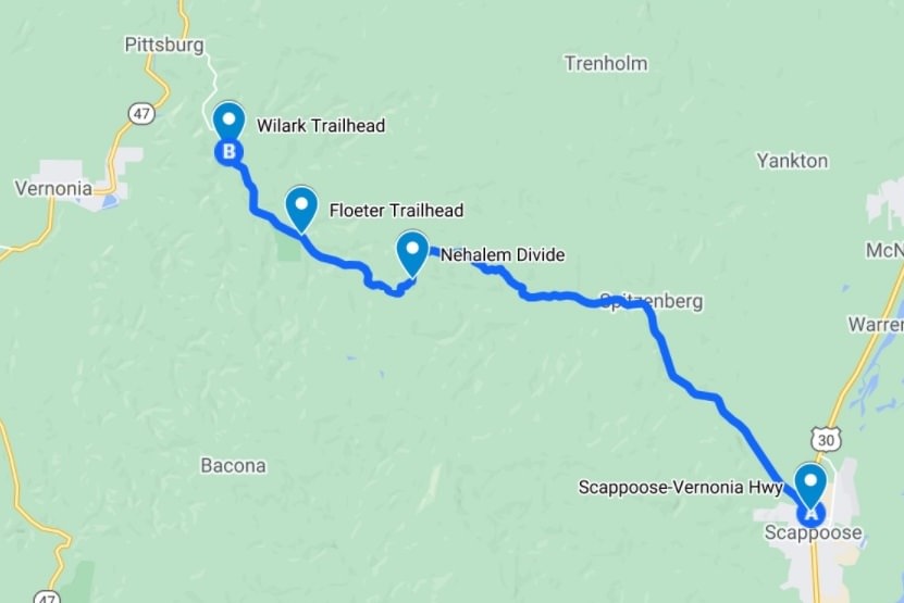 Wilark Trailhead (45.8694, -123.1238) is 2.5 miles further down on the left-hand side of Scappoose-Vernonia Highway at Pebble Creek MnLn. (Or alternatively, from Pittsburg turn off Hwy 47 southeast onto Scappoose-Vernonia Hwy and go 3.1 miles.)
