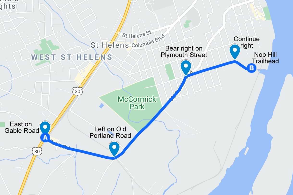 Where: Off of Highway 30 in St. Helens, turn east on Gable Road, continue left on Old Portland Road, and then bear right on Plymouth Street, reaching the water treatment plant at 451 Plymouth Street. The park is across from the plant (45.8563, -122.7997). There is also access from 3rd and 4th Street.
