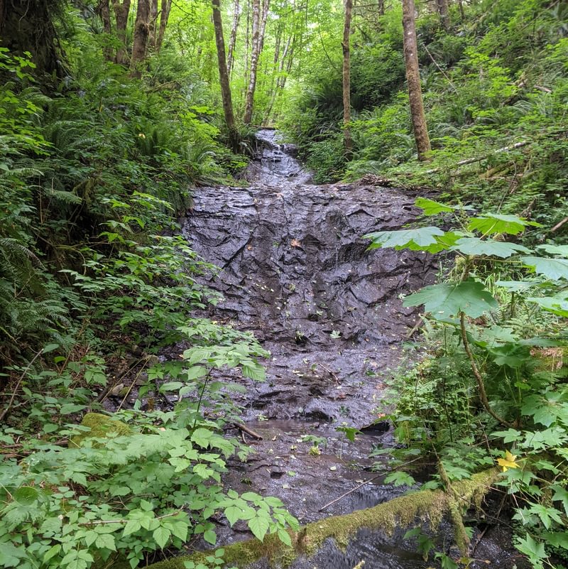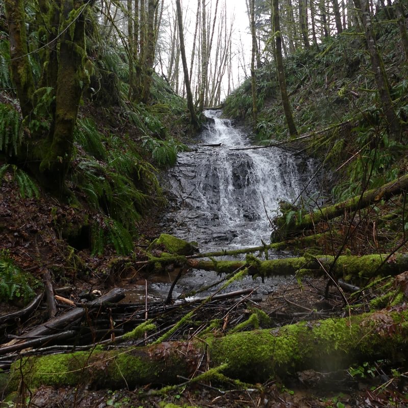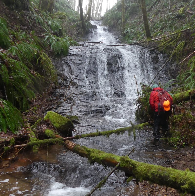Access: Parking is at the Weyerhaeuser access point on Apiary just north of the intersection with Meissner. From there it is ~2.5 miles to hike to the falls via logging roads. The road passes just upstream of the top of the falls, but best access to the bottom of the falls is via a game trail that starts along the road somewhat southwest of the creek crossing.