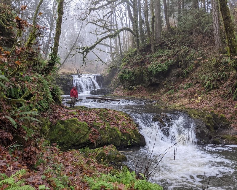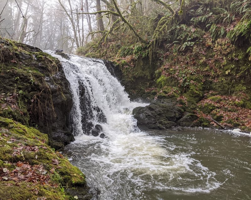 Interesting History: In the early 1900s, Tide Creek was a notable community, with its own post office, railway station, and ferry terminal. All of those facilities were well downstream of the falls.