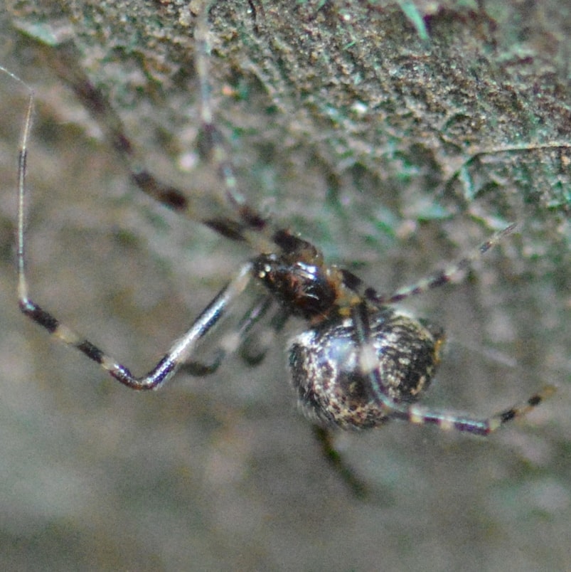 Common Candy-striped Spider – Can have 1 or 2 red stripes, or none at all. A Tangle Web Spider that builds cobwebs in corners and empty space. (photo © Grant Bassett )