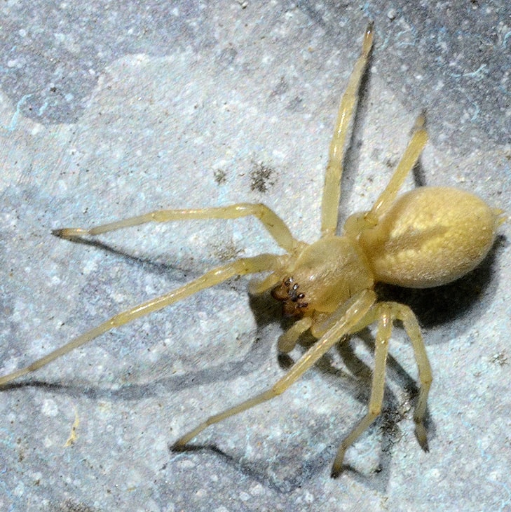 Yellow Sac Spider – Has no web but hides in silk sac, coming out at night to hunt. Often lives in homes and is responsible for human bites, but is not dangerous. (photo © giorege1959 )