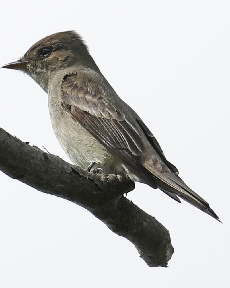 Dusky Flycatcher – Gray with round head, slender bill, and distinct eyering. Wings are short. Found in shrubby areas or open forest. Rarely seen in our area. (photo © Noah Strycker )