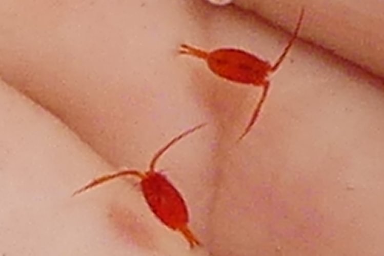 Calanoid Copepods – Tiny red crustaceans typically less than 0.1″ long. Often referred to as “plankton” in ocean, can reach large numbers in ponds. (photo © Jon Hakim)