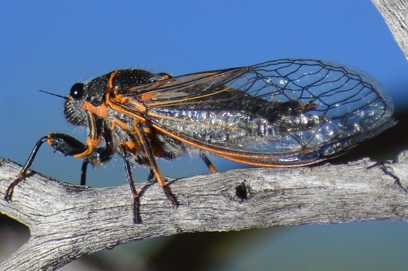 Putnam’s Cicada (Platypedia putnami ) – 0.9″. Black with bright orange borders, legs are black with orange joints. Hairy front and below. Clicking call like coins striking. Native to scrubland but found in orchards too. (photo © Randy Floyd )