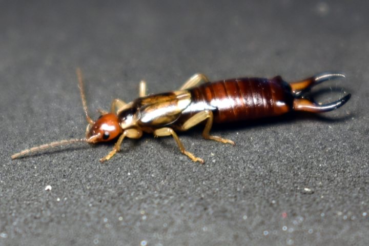 Earwigs are dark slender insects with short wings towards the front and a conspicuous set of “pinchers” at the rear. They are most closely related to stick insects and grasshoppers. Earwigs are found in moist regions such as gardens and basements, typically hiding under cover. They eat plants, fruit, and smaller insects.