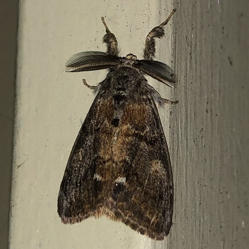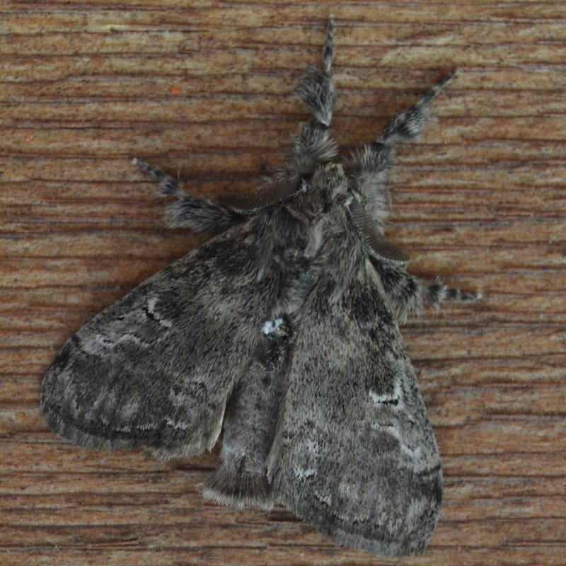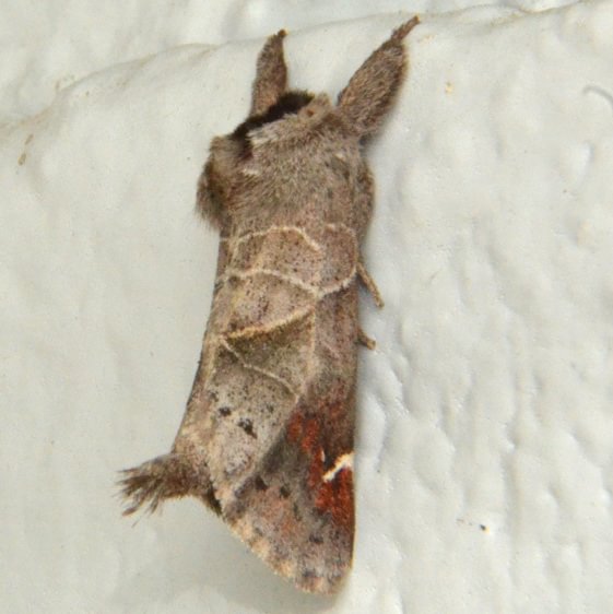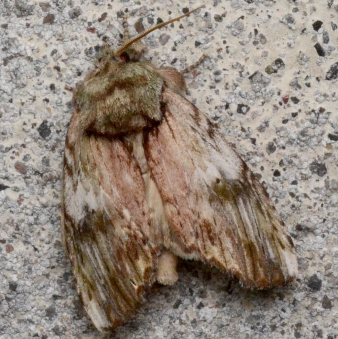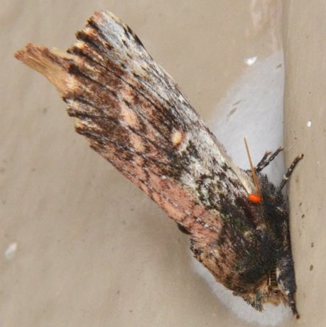Tufted Thyatirine (Pseudothyatira cymatophoroides ) – 1.6-1.7″. Gray to brown wings with pink or gold accents. Dark squiggle on wing near thorax, other faint squiggles. Crest of hairs on thorax. (photo © Jim Johnson )