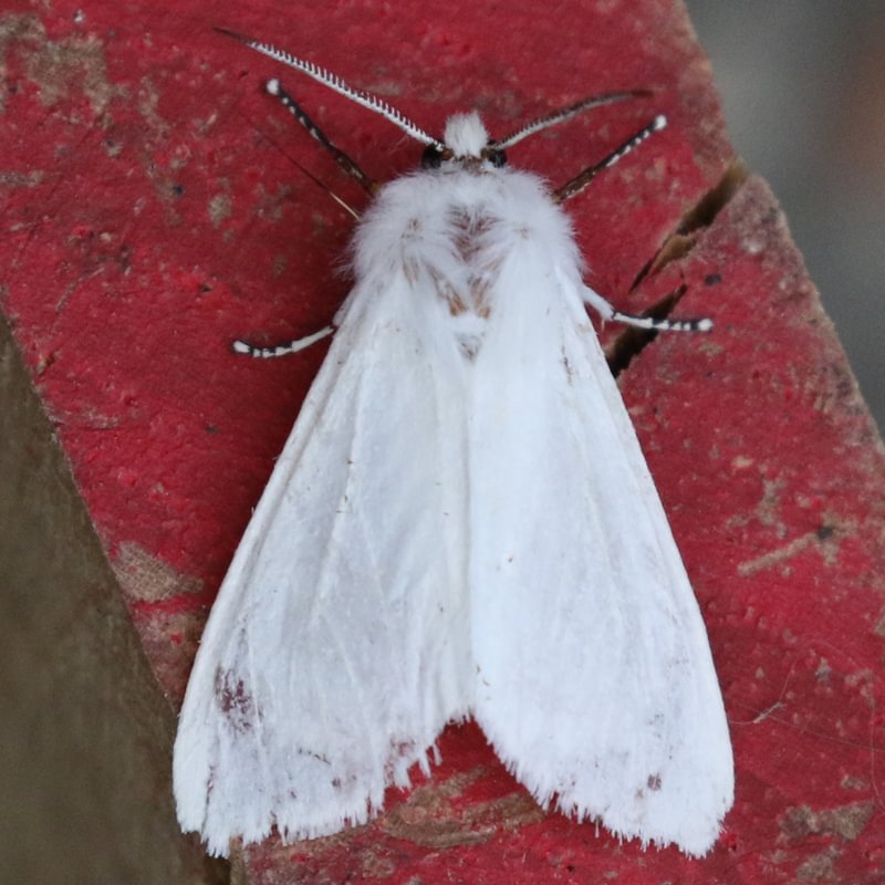 Vestal Tiger Moth ( Spilosoma vestalis ) – West Coast forest species with distinct red legs. (photo © fredvedder )
