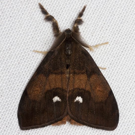 Western Dogwood Thyatirine (Euthyatira lorata ) – 1.75″. Dark gray wings with black-bordered light band through middle. White patches with black border and brown center on front and back. Larva feed on dogwood in wet mixed forest. (photo © Jim Johnson )