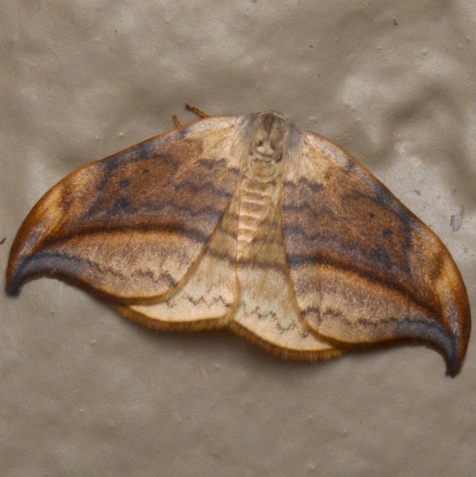 Arched Hooktip (Drepana arcuata ) – 1.5″. Yellow-brown with strong median line and multiple other wavy lines. Strongly “hooked” wings. (photo © Mike Patterson )