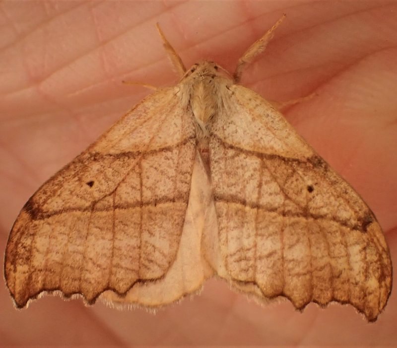 Two-lined Hooktip Moth (Drepana bilineata ) – 1.1″-1.4″. Light brown wings with pair of straight parallel lines, small black spot between. Scalloped back edge. (photo © Janice Arndt )