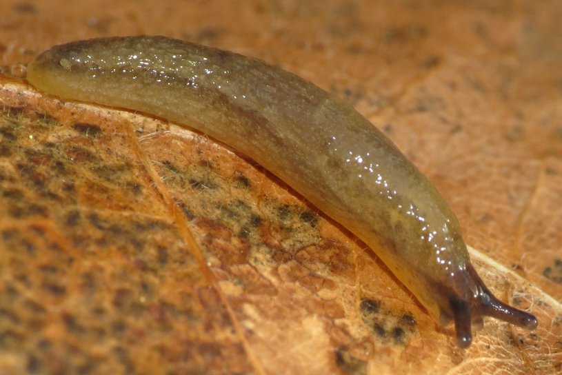 Meadow (Marsh) Slug – Around 1″. Brown with smoky dark tentacles. Tail is heavily furrowed. Found in wetlands and greenhouses, originally from Palaearctic/Nearctic but now worldwide. (photo © Casey H. Richart )